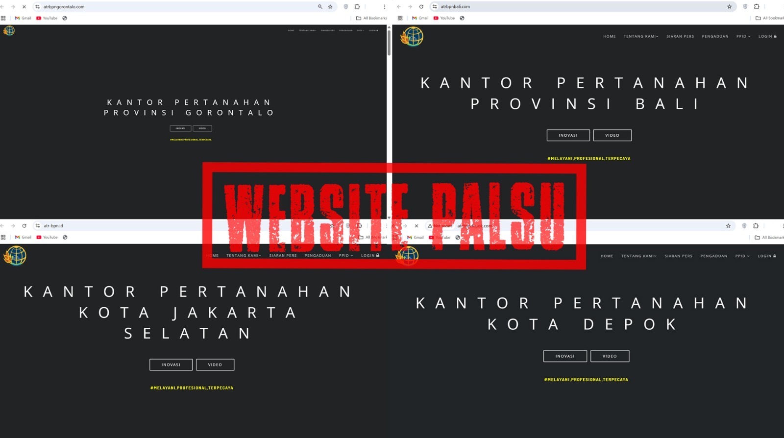 Harison Mocodompis mengungkapkan, pihaknya telah menerima sejumlah laporan terkait website palsu yang menyerupai portal resmi milik Satker-satker Kementerian ATR/BPN. Website tersebut menduplikasi isi dari website resmi Satker Kementerian ATR/BPN sehingga jika tidak teliti, masyarakat bisa mengira itu adalah situs resmi.