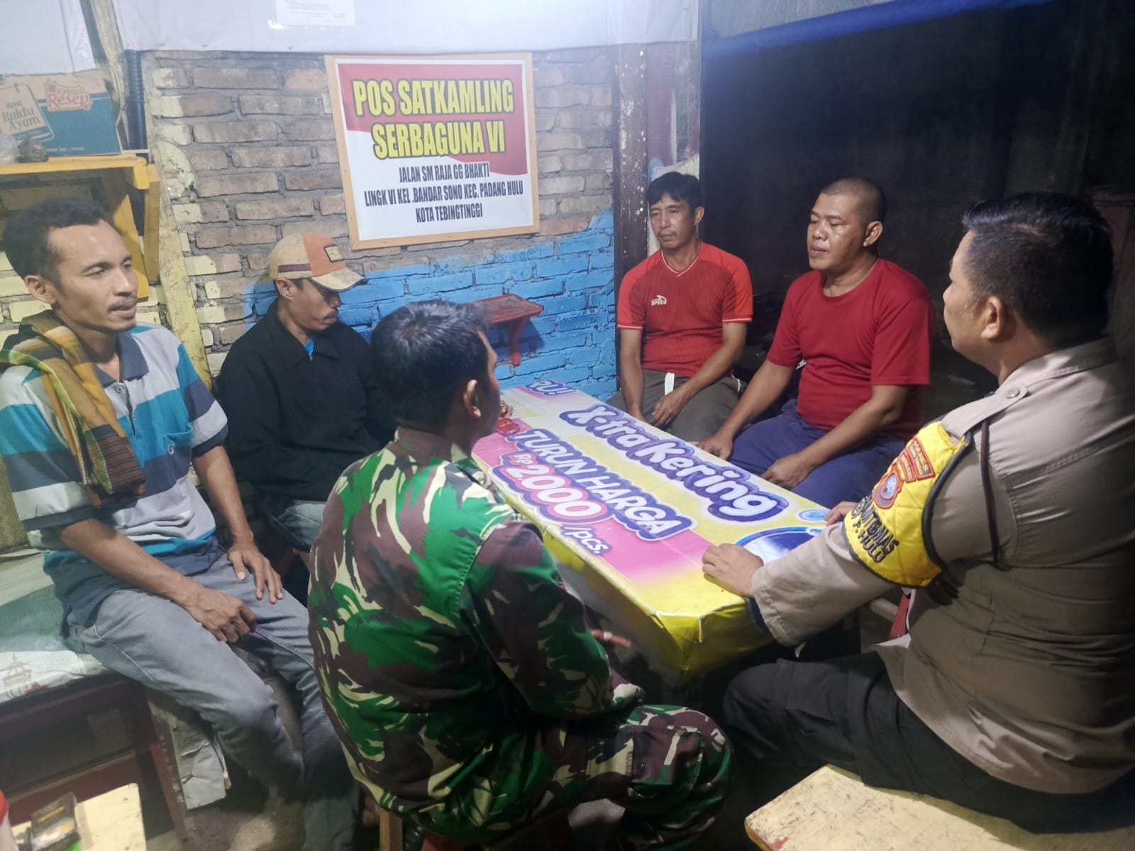 TEBING TINGGI – Bhabinkamtibmas Polsek Padang Hulu Polres Tebing Tinggi Aipda Adi Kuswono dan Aipda P Manurung, Babinsa Koramil 13/TT Kopda Risman dan Kepling VI Putra Damanik melakukan sambang dan monitoring sekaligus menyampaikan pesan kamtibmas di pos jaga dalam rangka menjaga keamanan dan ketertiban masyarakat yang berlangsung di Pos Satkamlkng Serbaguna VI Jalan SM Raja Gg Bhakti Lk 06 Kelurahan Bandarsono Kecamatan Padang Hulu Kota Tebing Tinggi, Senin (29/9/2025).