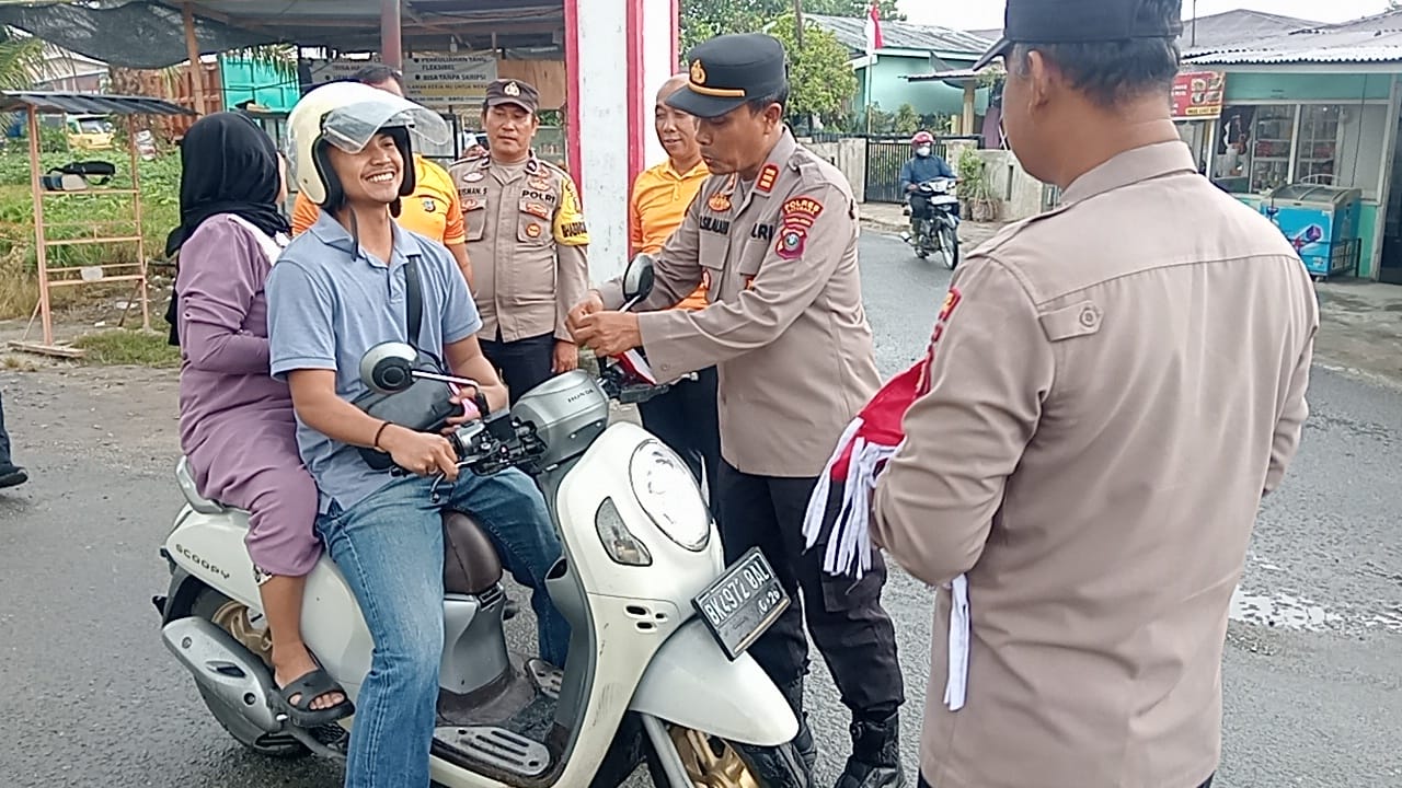 Gerakan pembagian bendera dilakukan untuk menggelorakan semangat kemerdekaan dengan berbagi bendera kepada masyarakat yang melintas di depan Mako Polsek Indrapura, Sebut Kapolsek AKP Reynold Silalahi.