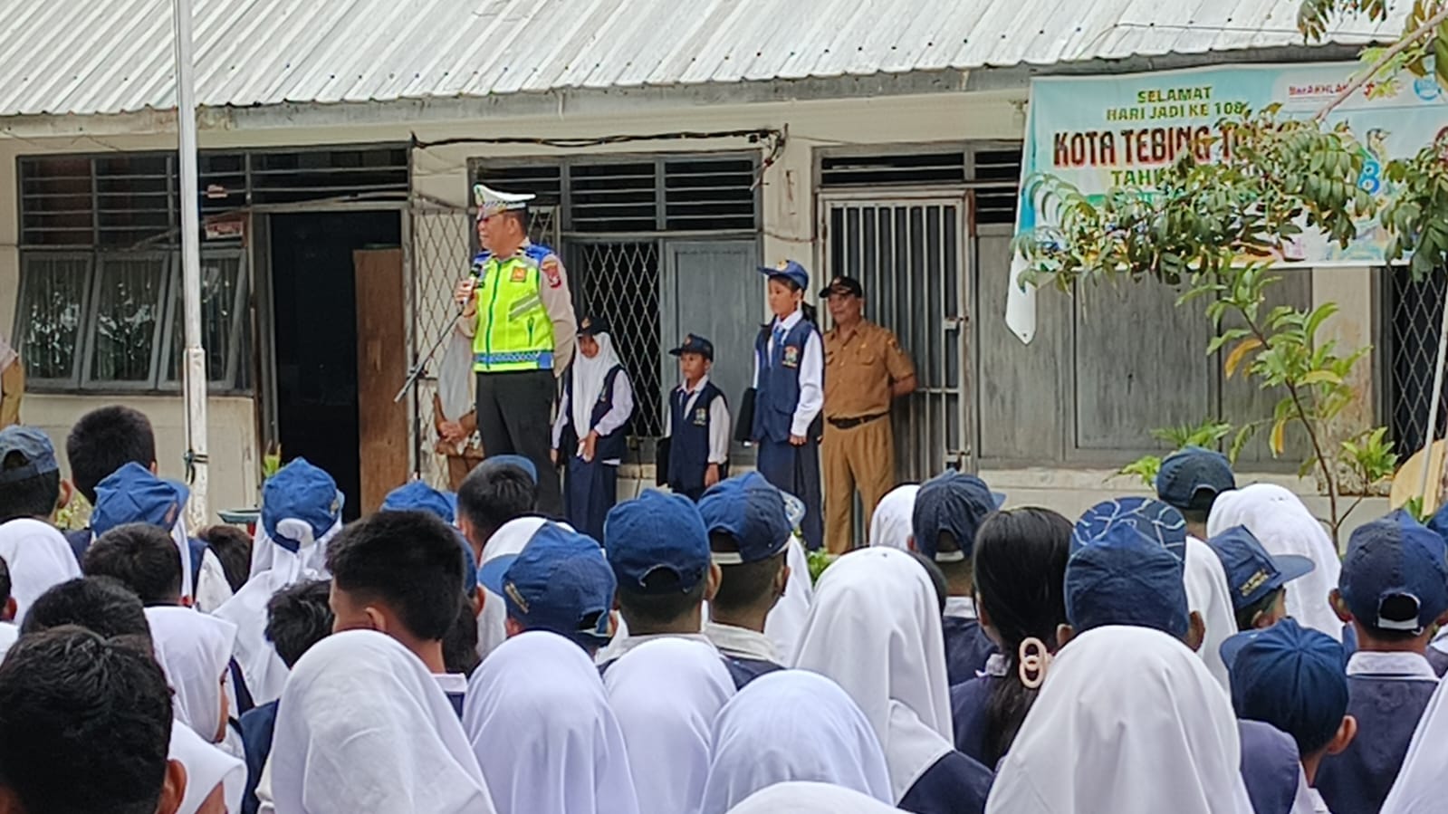 TEBING TINGGI – Melalui kegiatan Police Goes to School, Kanit Kamsel Satlantas Polres Tebing Tinggi Ipda Alan, SH menjadi pembina upacara bendera di SMP Negeri 3 Tebing Tinggi dengan menyampaikan himbauan dan sosialisasi tertib berlalulintas kepada para pelajar, Senin (6/10/2025).
