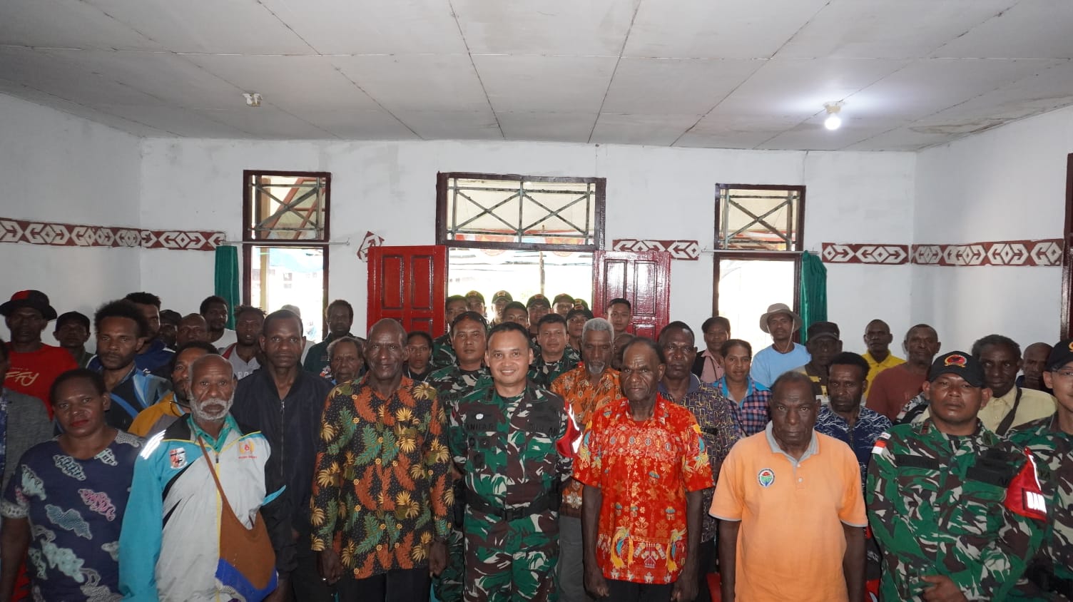 Dansatgas Yonif 123/Rajawali, Letkol Inf Anhar Agil Gunawan S.H., M.Han., bersama perwira dan personel satgas mengunjungi rumah dewan adat, berdialog dengan ketua adat, tujuh kepala suku, serta tokoh masyarakat. Mereka membahas aspirasi dan kebutuhan warga setempat.