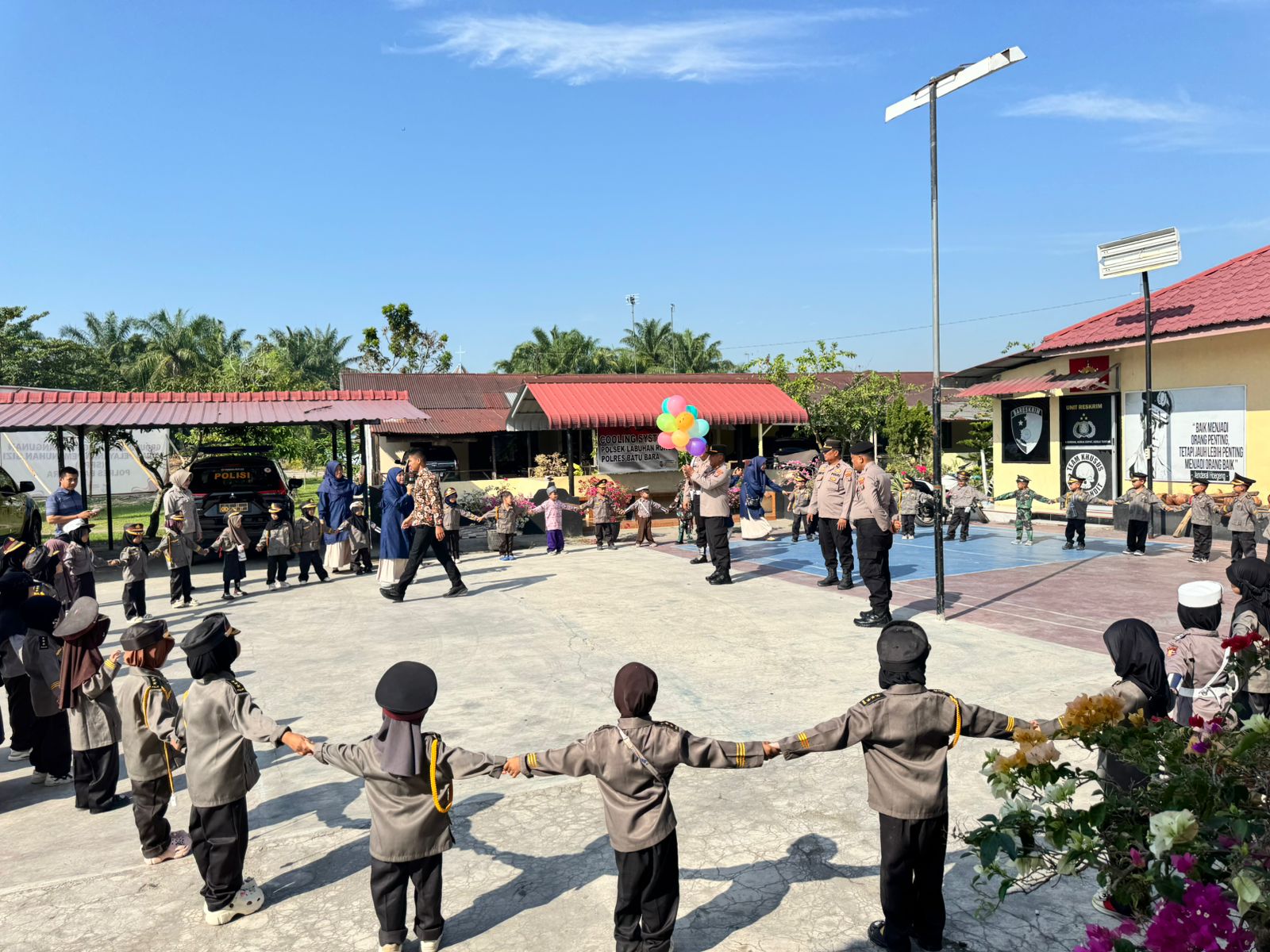BATU BARA – Kapolsek Labuhan Ruku AKP Cecep Suhendra, bersama personilnyaenerima kunjungan Para Siswa dari TK Al-Mukhlisin Kampung Lalang, Batu Bara, di Mako Polsek Labuhan Ruku, Rabu (23/7) Pukul.09.00 Wib.