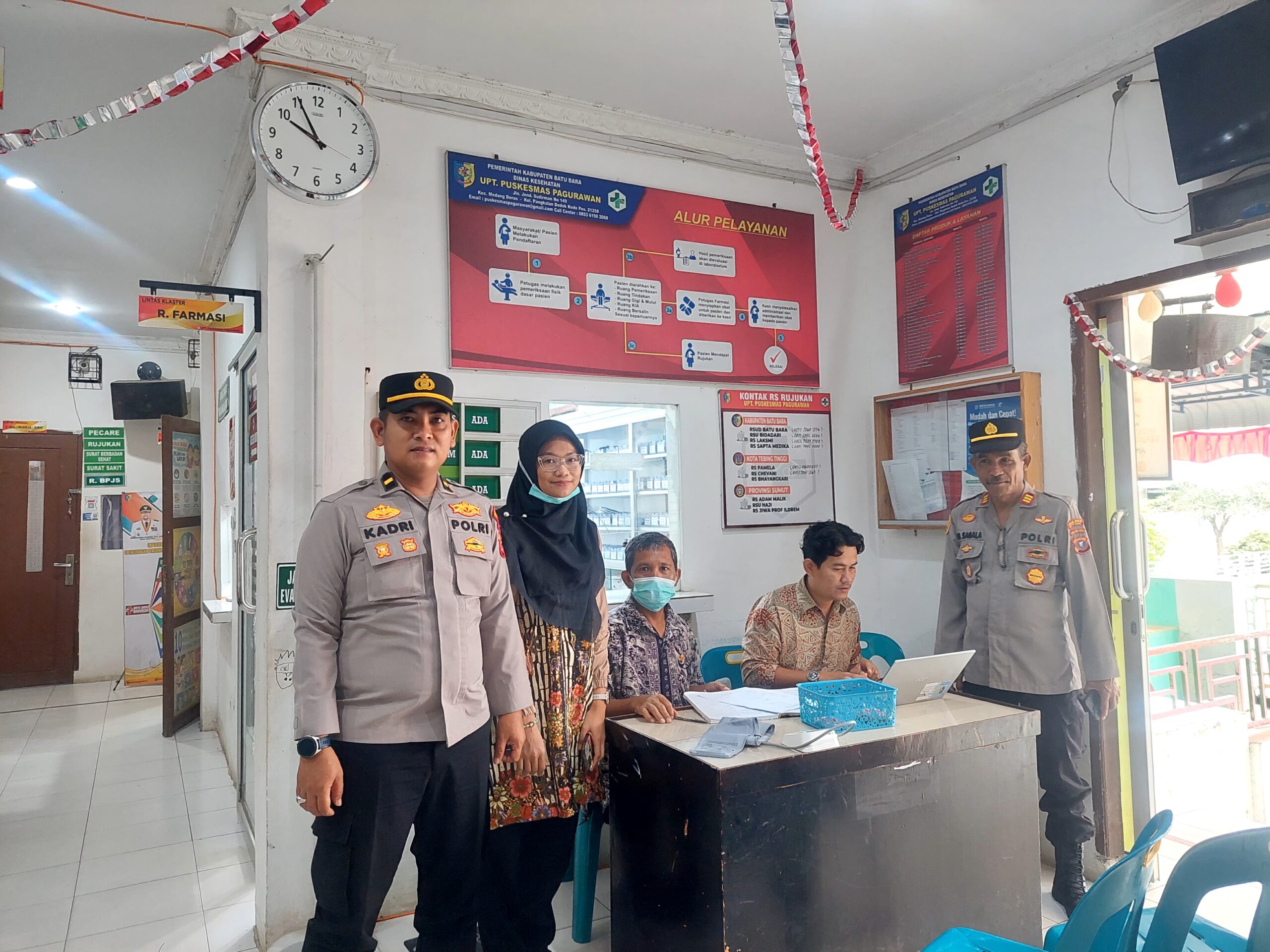 BATU BARA – Kapolsek Medang Deras Polres Batu Bara AKP A.H. Sagala, bersama personilnya, melaksanakan kegiatan Sambang, dan Cooling System dalam rangka menjaga Harkamtibmas, dan antisipasi Aksi Premanisme, di Puskesmas Pagurawan, Kecamatan Medang Deras, Batu Bara, Sumatera Utara, Jumat (29/8) Pukul.10.00 Wib.