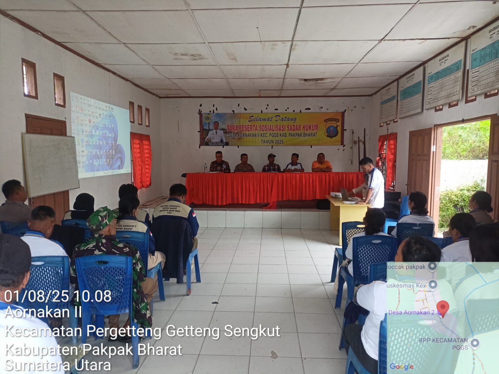 SALAK – Dalam memberikan pemahaman tentang Sadar Hukum Kepada Masyarakat di wilayah Hukumnya Polres Pakpak Bharat melalui Kapolsek Salak memberikan Materi Sadar Hukum dalam Sosialisasinya kepada masyarakat di Desa Aornakan II Kecamatan PGGS Kabupaten Pakpak Bharat, Jumat 01 Agustus 2025 sekira pukul 10.00 s/d 11.45 wib.