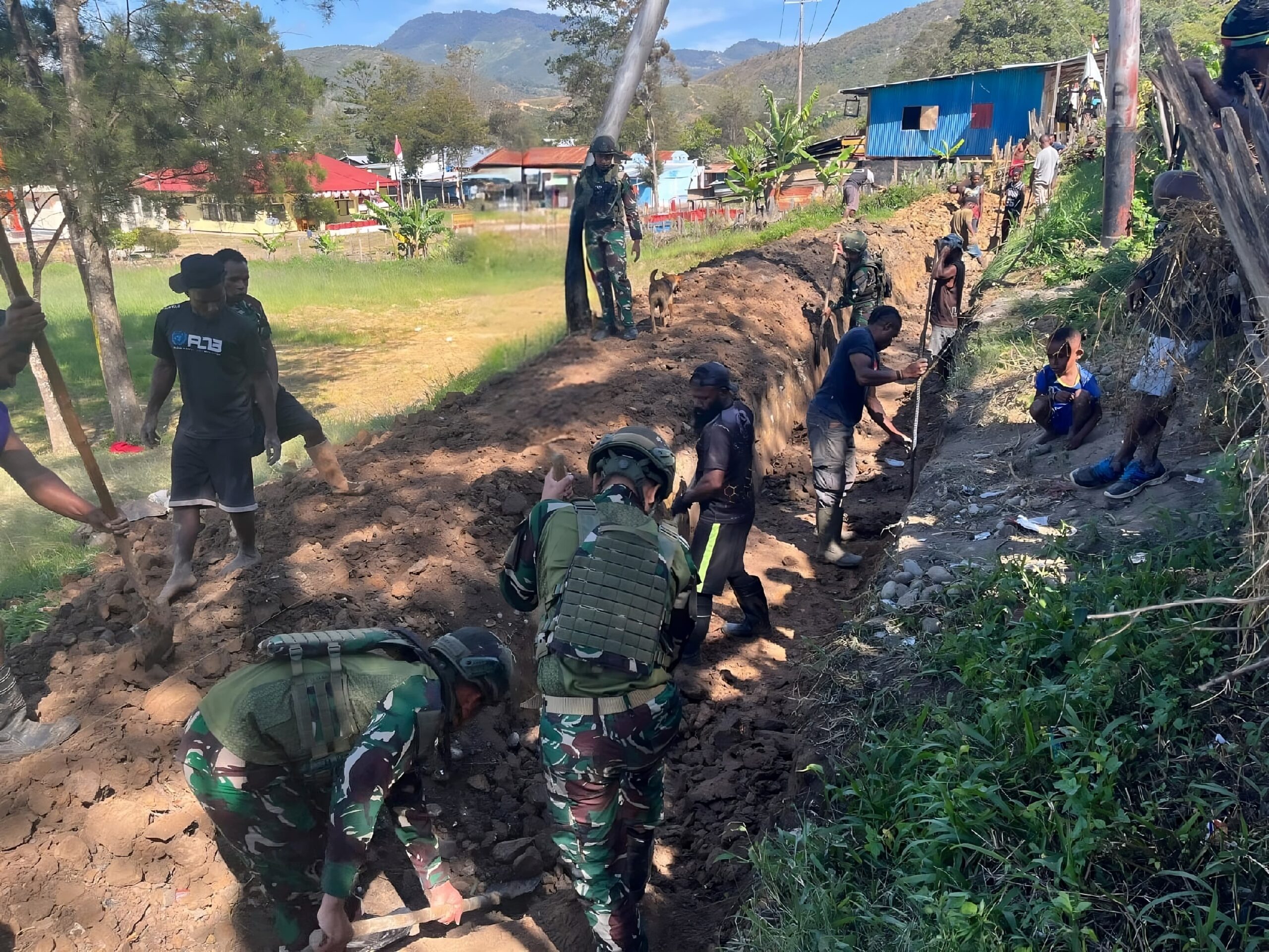 JAYAWIJAYA – Satgas Yonif 521/DY melalui Pos Bolakme bersama masyarakat Kampung Bolakme melaksanakan kegiatan karya bakti pembuatan parit di sekeliling lapangan Kampung Bolakme , Distrik Bolakme, Kabupaten Jayawijaya, Papua Pegunungan. (28/8/2025).