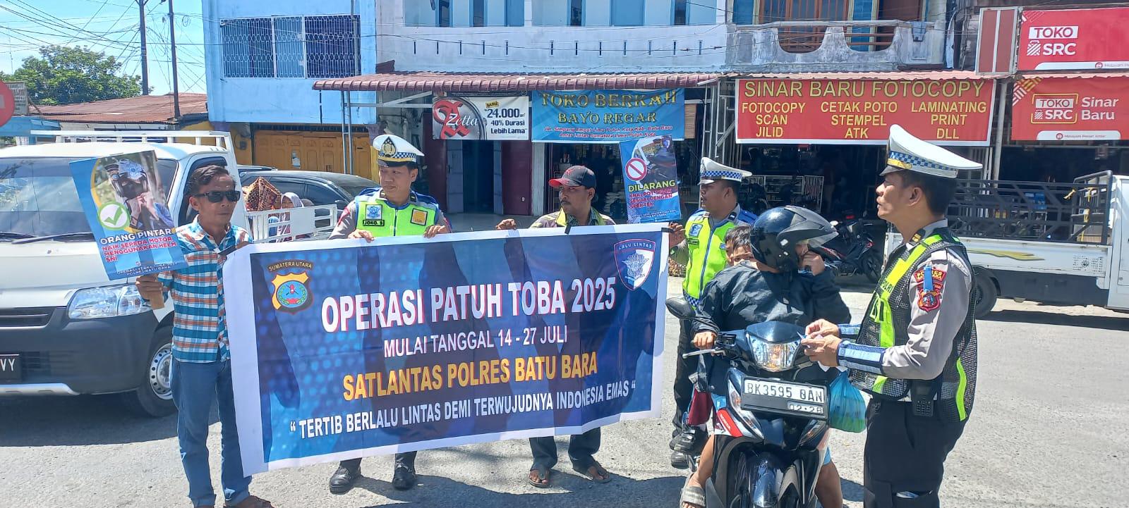BATU BARA – Kasatlantas Polres Batu Bara AKP Agnis Juwita, S.Ik, M.M, M.Si, bersama Personil Sat Lantas, memberikan himbauan tertib berlalu lintas, dan pemasangan stiker tertib berlalulintas dalam rangka Operasi Patuh Toba 2025, di Simpang Empat Lima Puluh, Batu Bara, Sumatera Utara, Selasa (22/7) Pukul.10.30 Wib.