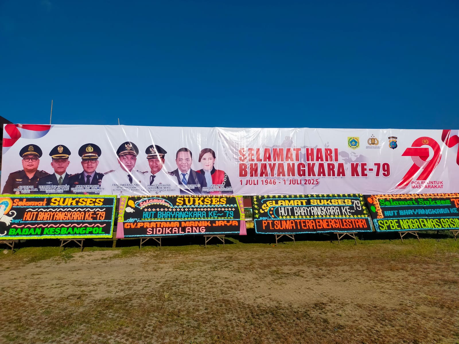 SALAK – Papan Bunga sebagai Bentuk Apresiasi dan Ucapan Selamat HUT Bhayangkara Ke – 79 Tahun 2025 kepada Polri Khususnya Polres Pakpak dan Testimoni dari masyarakat melalui pesan singkat WhatsApp di Hp sebagai simbol Dukungan masyarakat dan Stackholder yang mendukung kinerja Polri berjejer mengelilingi Lapangan Napasengkut yang merupakan lokasi Upacara HUT Bhayangkara Ke – 79 Tahun 2025 Polres Pakpak Bharat, Selasa 01 Juli 2025 sekira pukul 08.00 s/d 09.00 wib.