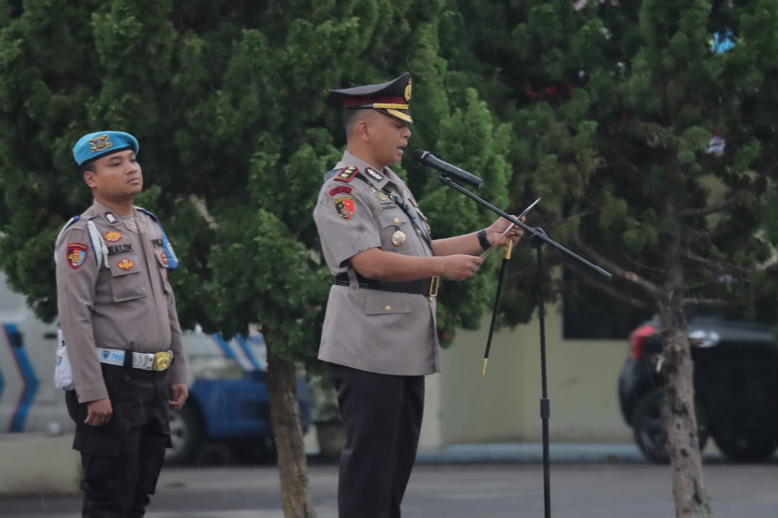 Walau diburu rintihan hujan, Gelaran Upacara Peringatan Hari Juang Polri yang bertemakan Dengan Semangat Hari Juang, Polri Untuk Masyarakat Menuju Indonesia Maju, tidak menyurutkan semangat damal melaksanakan upacara.