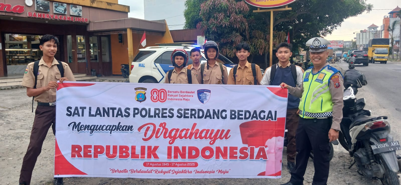SERGAI, – Sat Lantas Polres Serdang Bedagai (Sergai) melaksanakan giat dengan tajuk Polantas Menyapa dengan membagikan Bendera Merah Putih kepada masyarakat dan pengemudi dalam rangka Hari Ulang Tahun (HUT) Republik Indonesia Ke-80, sekaligus memberikan arahan tentang bagaimana berkendara dengan aman dan baik, bertempat di depan Kantor Dinas Pendidikan dan Simpang Pasar Rodi, Sergai, Sumatera Utara, Jumat (8/8/2025).