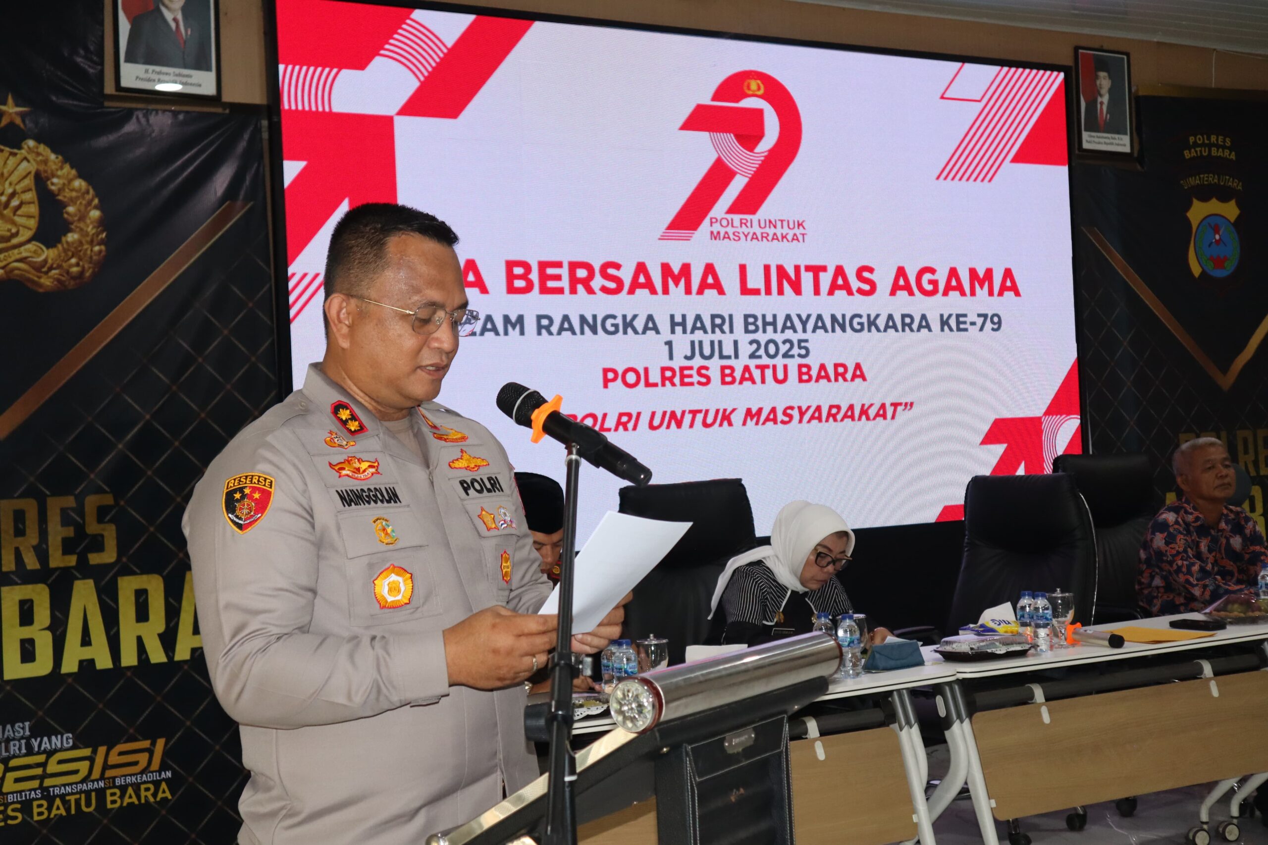BATUBARA – Polres Batu Bara melaksanakan giat Doa Bersama Lintas Agama Jelang Hati Ulang Tahun Bhayangkara Ke-79 di Aula Sarja Arya Racana Mako Polres Batu Bara Jalan Perintis Kemerdekaan, Batu Bara, Sumatera Utara, Kamis (26/6) Pukul.09.30 Wib.