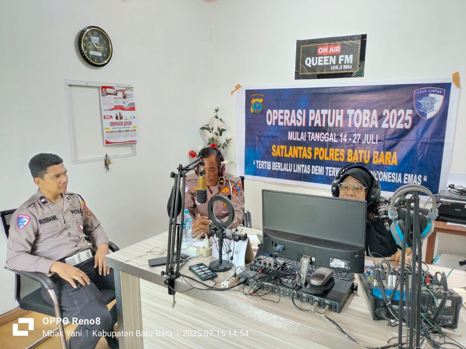 BATU BARA – Kasatlantas Polres Batu Bara AKP Agnis Juwita, S.Ik, M.M, M.Si, bersama personilnya memberikan himbauan tertib berlalu lintas kepada masyarakat pengguna jalan dalam rangka Operasi Patuh Toba 2025, melalui radio Queen FM Indrapura, Batu Bara, Sumatera Utara, Selasa (15/7) Pukul.14.00 Wib.