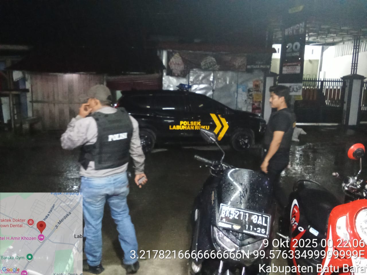 BATU BARA – Personil Polsek Labuhan Ruku Polres Batu Bara melaksanakan Patroli Mobile dengan menyusuri, Simpang Empat, Gang Solo, Terang Bulan, dan Kantor Camat Tanjung Tiram, Batu Bara, Sumatera Utara, Rabu (8/10) Pukul.23.00 Wib.