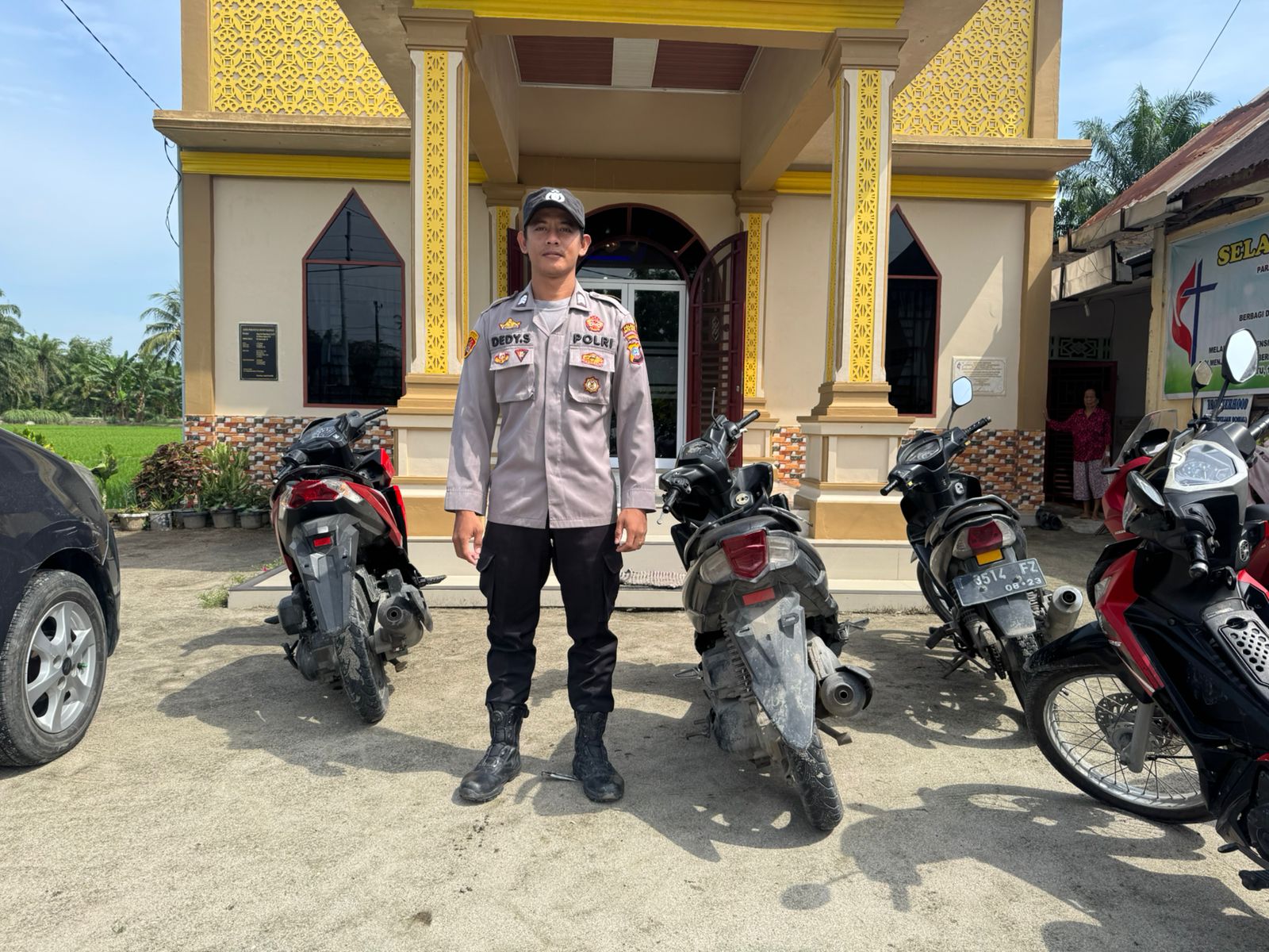 BATUBARA – Personil Polsek Medang Deras Polres Batu Bara Beihadie Dedy Sitinjak, S.H, melaksanakan pengamanan Ibadah Minggu di Gereja GMI Siin Desa Pakam Raya, Kecamatan Medang Deras, Batu Bara, Sumatera Utara, Minggu (6/7) Pukul.10.00 Wib.