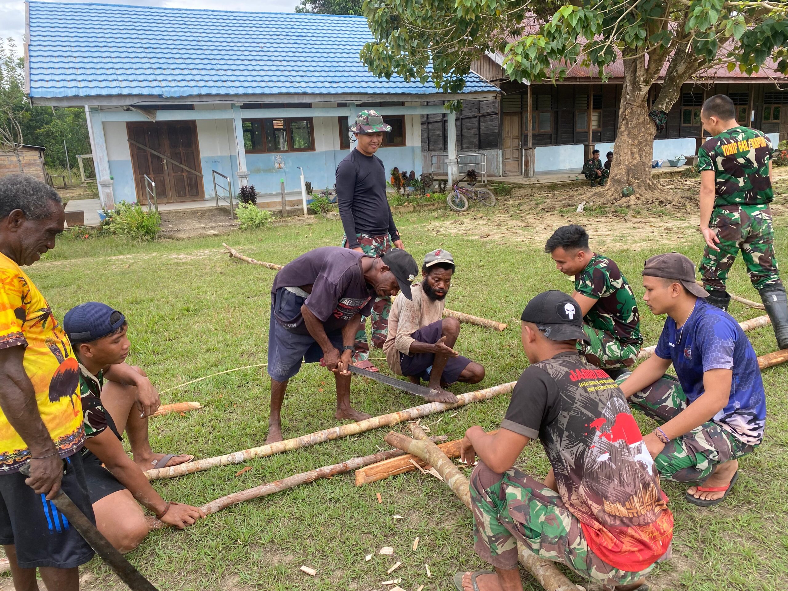 TELUK BINTUNI – Satgas Pamtas Kewilayahan Yonif 642/Kps, Pos Jagiro melaksanakan gotong royong membangun tenda untuk kegiatan OMK (Orang Muda katolik) yang dilaksanakan di Kampung Jagiro, Distrik Moskona Selatan Kabupaten Teluk Bintuni, Provinsi Papua Barat. (22/6/2025).