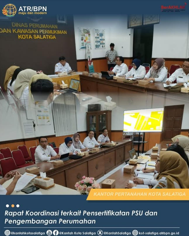 Bertempat di Ruang Rapat Dinas Perumahan dan Kawasan Permukiman Kota Salatiga, telah dilaksanakan Rapat Koordinasi terkait Pensertifikatan Prasarana, Sarana, dan Utilitas Umum (PSU) serta rencana Pengembangan Perumahan di wilayah Kota Salatiga. Rapat ini dihadiri oleh Kepala Seksi Penataan dan Pemberdayaan, Kepala Seksi Survei dan Pemetaan, beserta jajaran staf teknis terkait.