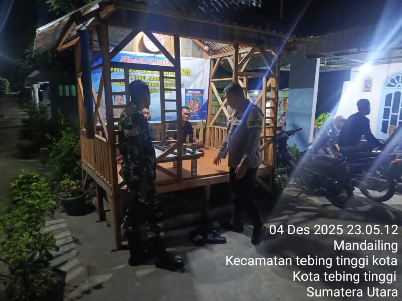TEBING TINGGI – Guna memastikan keamanan lingkungan, Polres Tebing Tinggi melalui Bhabinkamtibmas Polsek Padang Hulu melaksanakan kegiatan sambang dan monitoring ke Pos Satkamling Lk II Jalan Selat Bangka Kelurahan Mandailing, Kota Tebing Tinggi Kota, pada Kamis malam (4/12/2025).