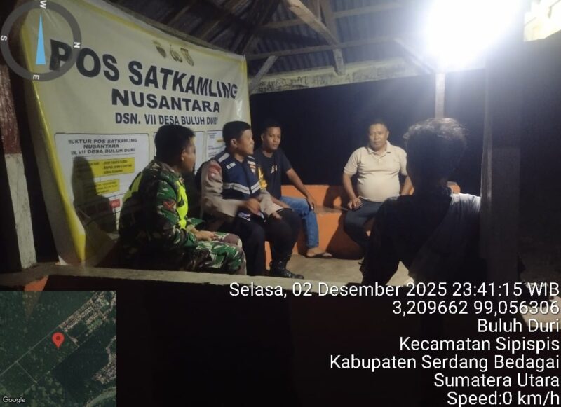 TEBING TINGGI,  – Dalam rangka menjaga situasi Kamtibmas yang kondusif, Bhabinkamtibmas Polsek Sipispis Polres Tebing Tinggi Aiptu Aturudin Manurung bersama Kadus VII Kusnadi melaksanakan kegiatan sambang ke Pos Satkamling yang terletak di Dusun VII Desa Buluh Duri Kecamatan Sipispis Kabupaten Serdang Bedagai, Selasa malam (2/12/2025).