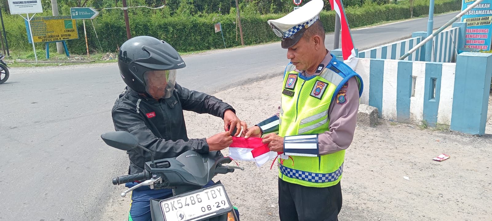 BATU BARA – Kapos Lantas Polres Batu Bara, Aiptu Sartono, bersama Aiptu A. Rajagukguk, membagikan Bendera Merah Putih di Jalinsum Simpang Pos Lantas Sei Bejangkar, Batu Bara, Sumatera Utara, Jumat (15/8) Pukul.11.15 Wib.