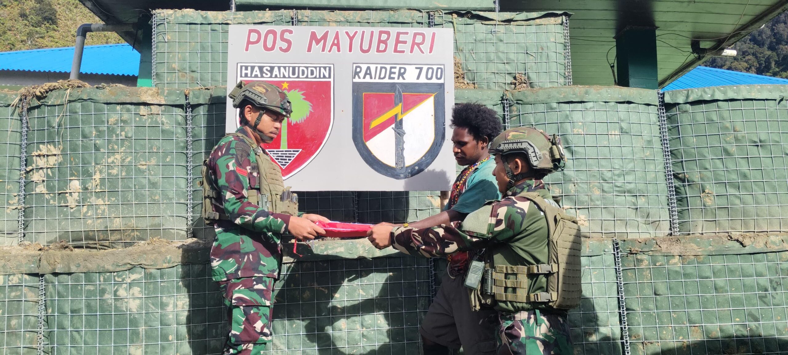 PUNCAK — Semangat merah putih kembali berkibar di Kampung Mayuberi, Distrik Ilaga Utara, Kabupaten Puncak. ( 24/8/2025). Satgas Yonif 700/WYC melalui Pos Mayuberi melaksanakan kegiatan Binter terbatas dengan memberikan bendera Merah Putih serta perlengkapan olahraga berupa bola voli dan net kepada tokoh pemuda kampung, Solianus.