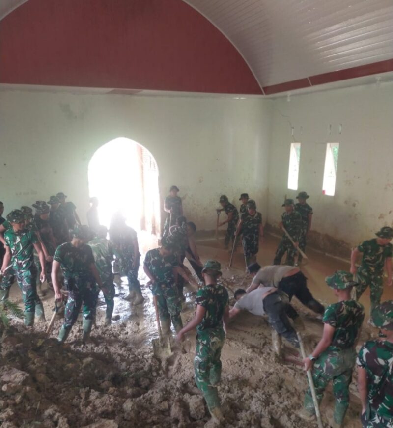 Sinergitas TNI-Polri Dan Pemkab Pakpak Bharat Bersihkan Gereja St. Fransiskus Assisi Terdampak Bencana Longsor