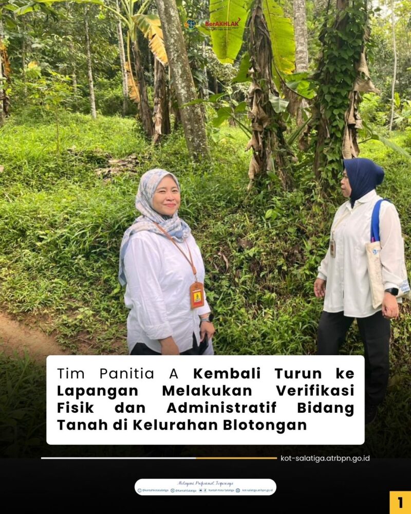 Tim Panitia A Kantor Pertanahan Kota Salatiga kembali melaksanakan kegiatan cek lapang dan pemeriksaan berkas lapangan terkait proses pengumpulan data fisik serta administrasi permohonan pertanahan di Kelurahan Blotongan. Kegiatan ini merupakan bagian dari tahapan penting dalam memastikan keabsahan dan ketepatan data sebelum proses selanjutnya dilakukan.